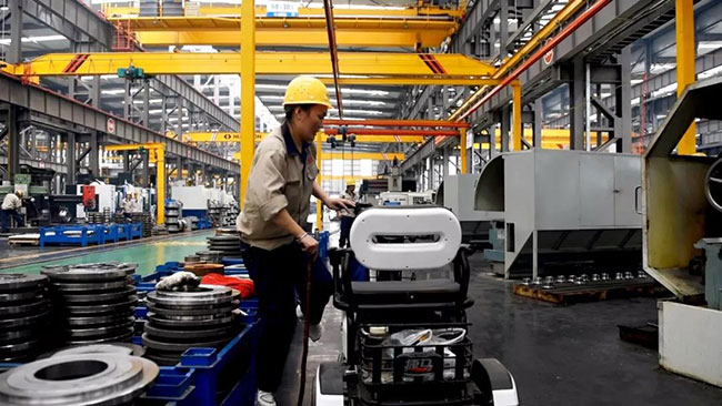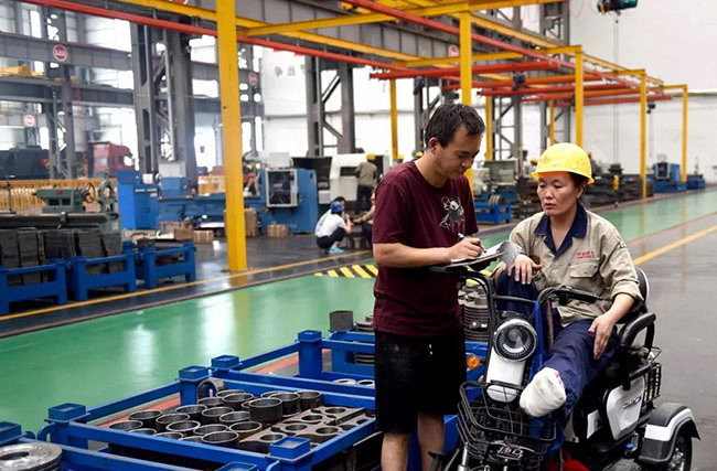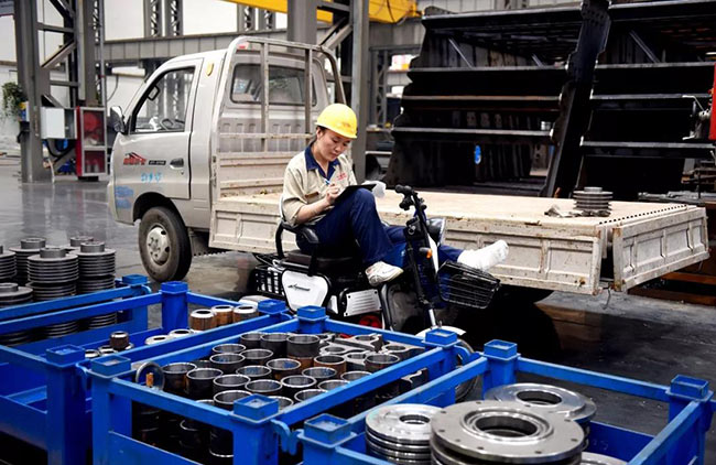7月22日上午10點,中譽鼎力智能裝備生產車間機加工區新到了一批外協件,張衛霞坐在電動三輪車上依次仔細地檢查著每一個零部件:觀察、測量、記錄、填單……嚴謹的質檢流程沒有因為腳受傷而有所耽誤。