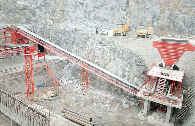 工藝流程:原料經料倉由ZG1550振動給料機送到重型錘式破碎機PCZ1615進行初步破碎,破碎后的物料被輸送到整形破XPC1622進行加工,加工后的物料輸送到一組3YKZ3070并篩進行篩分,篩分三種成品料,其中一部分被送到雙轉子制砂機ZSJ1218進行細碎,不滿足成品料粒度要求的被返回整形破進行再次加工,其余物料被送到下一組3YKZ3070并篩進行篩分,篩分出三種成品料,分別送到成品料倉中。